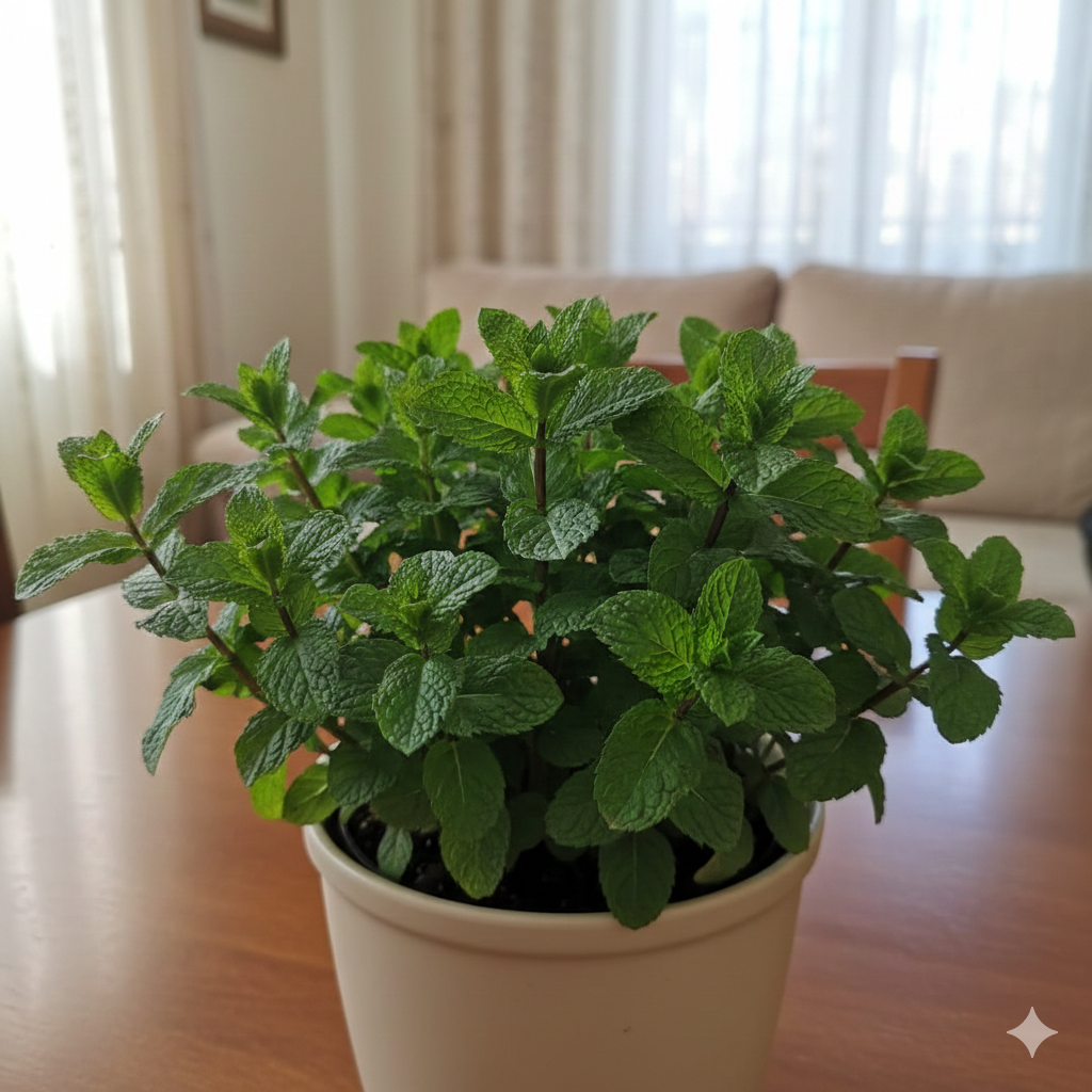 Запашна, прохолодна та неймовірно ароматна. Кімнатна м’ята росте швидко, дає багато соковитих листків і чудово відновлюється після зрізання. У квартирі формує густий кущик із насиченим м’ятним ароматом, значно яскравішим, ніж у магазинної зелені. Зрізали гілочку — і вже через кілька днів з’являються нові молоді листочки. М’ята росте хвилями та завжди під рукою для свіжості.